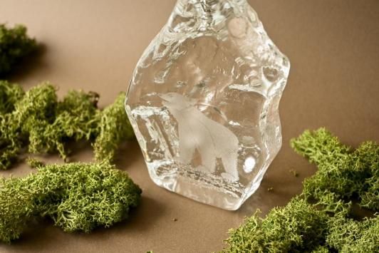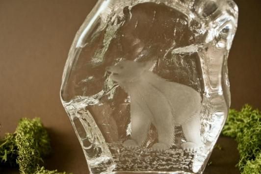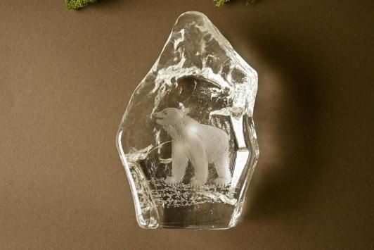 氷を削り出したようなガラスに、表と裏側からエッチングを施して懐かしい景色を描いた、