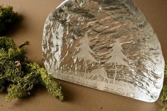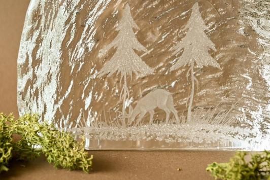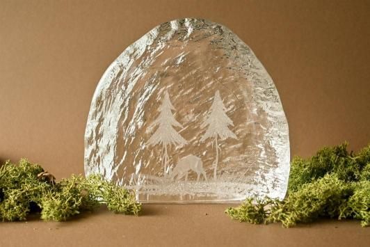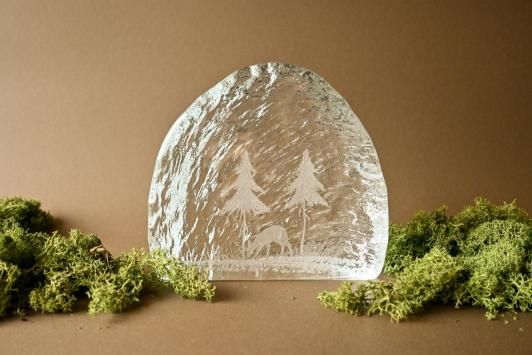 Size : H13.8cm×W15.4cm×D4.9cm 氷を削り出したようなガラスに、表と裏側からエッチングを施して懐かしい景色を描いた、 仕掛けのあるガラスオブジェです。 描かれているのは森の奥で草を食む子鹿の姿。 多面に仕上げられて光が溢れるようにオブジェに注ぎ込まれ、 とっても素敵なアイディアで作られたオブジェですね。 目だった傷かけのない、ヴィテージ品として大変良い状態です。