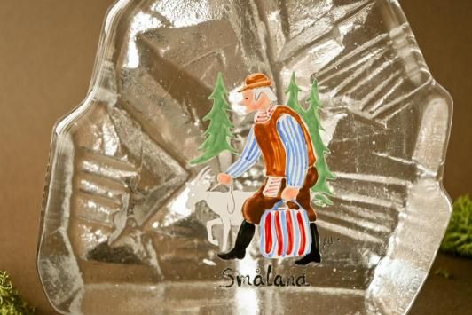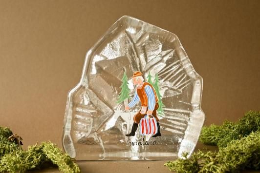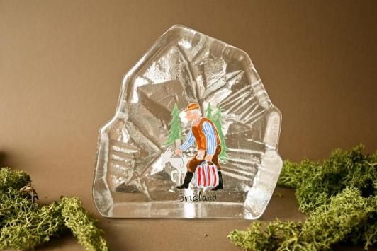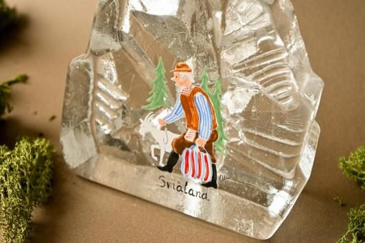 氷を削り出したようなガラスに、明るい色使いでお爺さんと山羊が歩くほのぼのとした姿が描かれた、仕掛けのあるガラスオブジェです。