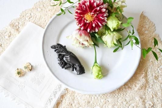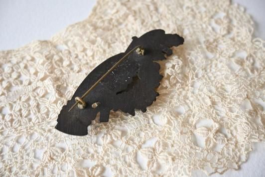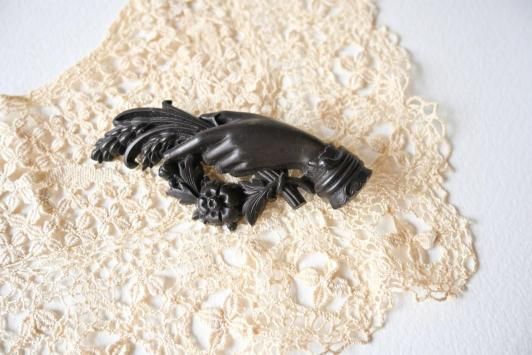 Size : H8.3cm×W3.5cm 実りの季節を思わせるような、ハンドモチーフのブローチです。 素材はプラスティックより、もう少しカゼインなどが入った古い時代の素材と思われます。 たっぷりとした冬のニットに合わせたらきっと素敵ですよ。 ピンの具合も良く、アンティーク品として大変良い状態です。