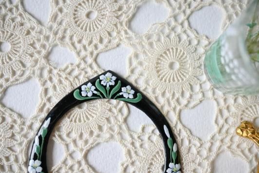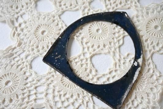 Size : H7.2cm×W7.3cm 手のひらくらいのサイズのメタルのフレームにエナメル彩色が施された 何かのパーツです。 フォトフレーム用なのか、それとも装飾品を作るためなのか、 もしかしたらベルトのバックルを作るパーツなのか...謎に包まれたままですが、 黒いエナメルに描かれた白いお花が目を惹き手にしました。 革紐などをつけて、ペンダントにしたらたっぷりと大きなニットによく似合うと思います。 また写真を飾るのにお使いいただくのもおすすめです。 状態については画像にてご確認ください。