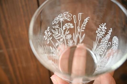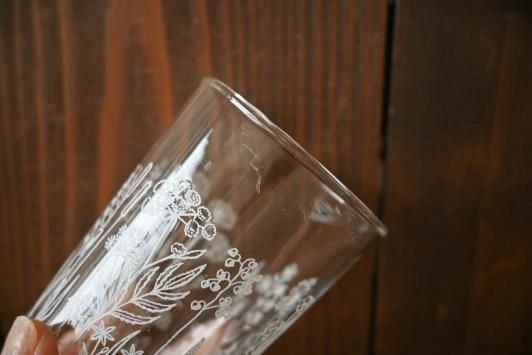 白い釉薬で野の花がぐるりとプリントされた、厚手のしっかりとしたガラスコップです。