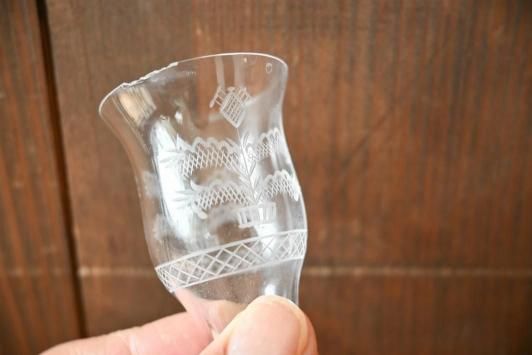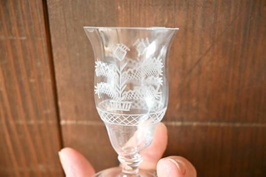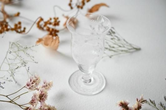 Size : φ4.1cm×H7.5cm エッチングによるボタニカルデザインが施された、繊細なリキュールグラス。 口元にチップがあるので、画像にてご確認ください。