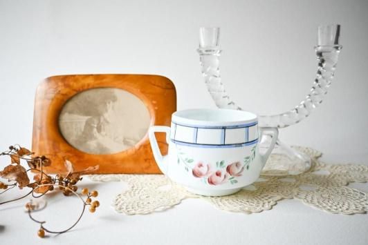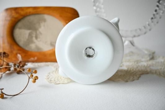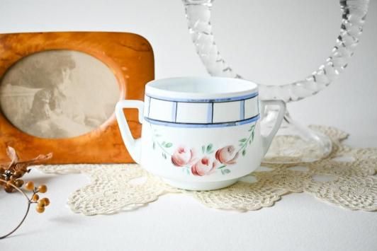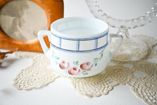 Size : φ8.3cm×H7.5cm×W13.0cm ミルクガラスにオールドローズが描かれたシュガーボウルです。 今回はミルクガラス×ロマンティックなお花ペイントのガラスアイテムをあちこちで見かけて なんだか嬉しい気持ちになりました。 目立った傷かけのない、アンティーク品とした大変良い状態です。