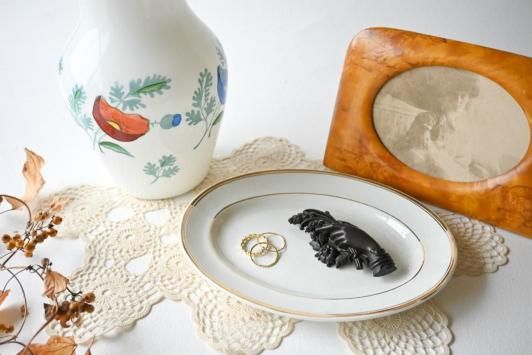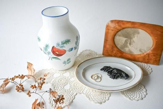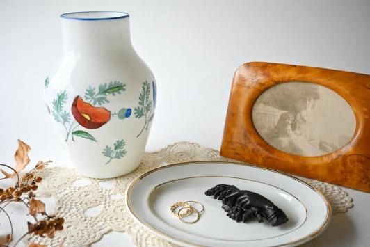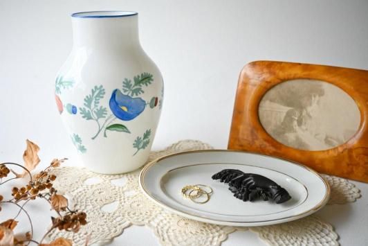 Size : φ6.2cm×H17.0cm×W12.0cm 薄手のミルクガラスに赤と青のペイントでアネモネがぐるりと描かれた とっても素敵なフラワーベースです。 今回はミルクガラス×ロマンティックなお花ペイントのガラスアイテムをあちこちで見かけて なんだか嬉しい気持ちになりました。 このフラワーベースは口がたっぷりと広いので 小さな細かい葉っぱのお花をたっぷりと生けるのもおすすめです。 何もいけていなくても、絵柄だけでも楽しめますね。 傷かけのない、大変良い状態です。