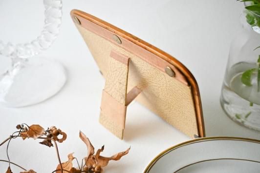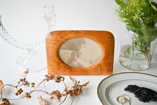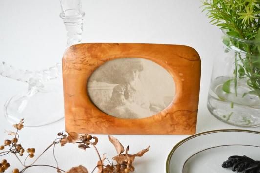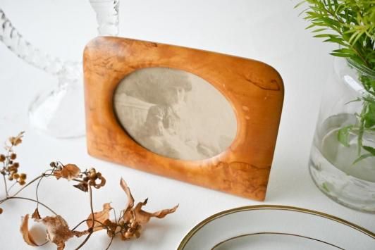 Size : H11.7cm×W17.0cm オーバル部分 H7.8cm×W10.8cm 1800年代後半を中心に、1920年代くらいまで多く作られていたという、 木製のフォトフレームです。 ストックホルムのヒョートリエットの蚤の市で見つけました。 このような横型のデザインに出会ったのは初めて! とても飾りやすく、インテリアによく馴染むデザインだと思います。 目立った傷かけのない、アンティーク品として大変良い状態です。