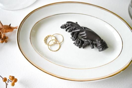 Size : W18.0cm×D13.4cm グスタフスベリ社の、アンティークのおままごとセットから、金彩の美しい オーバルのプレートをご紹介します。 おままごとセットからの一枚とはいえ、サイズ的にちょうど使いやすいサイズで 個人的に好きな質感でもあり大変おすすめの一枚です。 目立った傷かけのない、アンティークとして大変良い状態です。