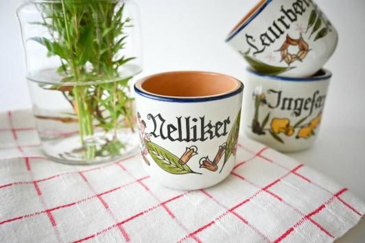 SIze : φ7.0cm×H6.5cm スウェーデンで見つけた、デンマーク製 KNABSTRUPのスパイスホルダーです。 蓋のない状態で見つけたため、小さな花瓶やスプーン立てなどの小物入れにお使いください。 5種類のスパイス、少し大きいサイズのマーマレードと組み合わせても可愛いですね! どれも傷かけのない、ヴィンテージ品として大変良い状態です。