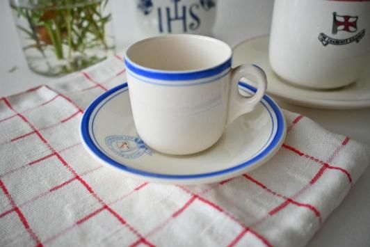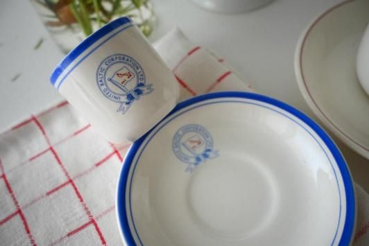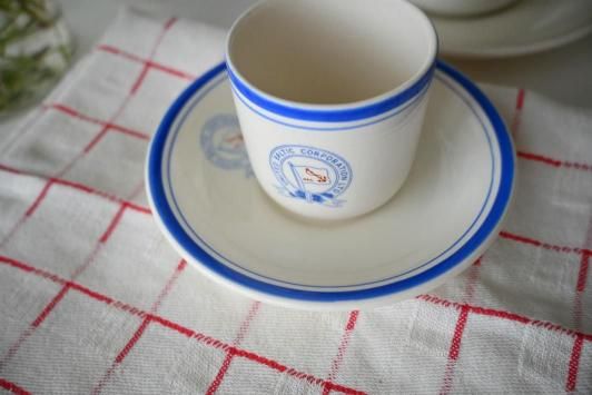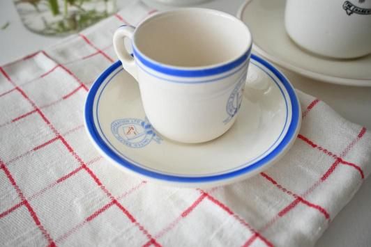 カップ : φ5.5cm×H5.5cm×W7.5cm ソーサー : φ11.5cm スウェーデンで見つけた、イギリス製の業務用(ホテルや食堂、ダイナーなどへの卸用)に作られた しっかりとした手触りのデミタスカップ&ソーサーです。 同じ形でカタログなどからオーナーが選び、ロゴなどを一緒にデザインしてプリントされたものです。 今回はこういった業務用テーブルウェアのコレクターの方のコレクションから、 rytasでご紹介するのに良いな、と思ったいくつかを譲っていただきました。 目だった傷かけのない、ヴィンテージ品として大変良い状態です。