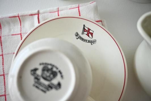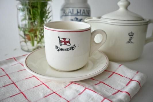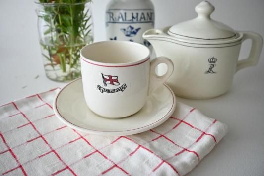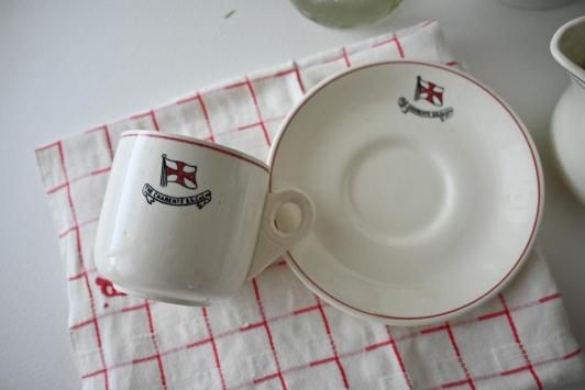 カップ : φ7.7cm×H7.4cm×W10.6cm ソーサー : φ14.7cm スウェーデンで見つけた、イギリス製の業務用(ホテルや食堂、ダイナーなどへの卸用)に作られた しっかりとした手触りのコーヒーカップ&ソーサーです。 同じ形でカタログなどからオーナーが選び、ロゴなどを一緒にデザインしてプリントされたものです。 今回はこういった業務用テーブルウェアのコレクターの方のコレクションから、 rytasでご紹介するのに良いな、と思ったいくつかを譲っていただきました。 目だった傷かけのない、ヴィンテージ品として大変良い状態です。