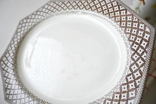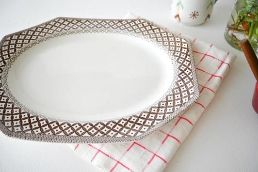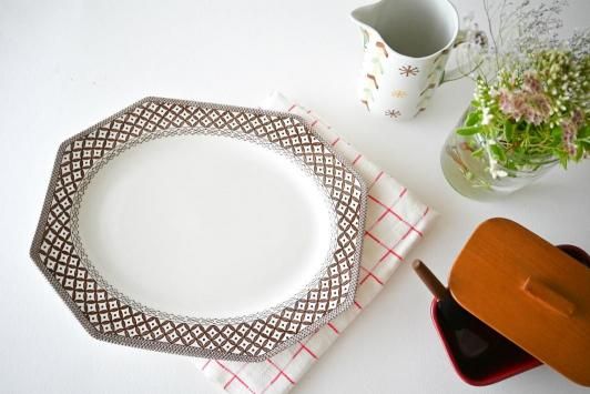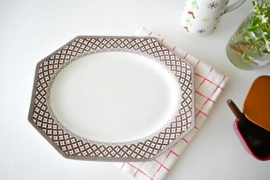 W31.2cm×D24.5cm イギリス・Royal Staffordshire社のちょっと変わった変形八角形のプレートです。 チキンローストとお野菜をテーブルに出すときなどに使いやすいサイズで、 友人が集まるテーブルにぴったりです。 カトラリーチップなどは見られますが、全体的に目立った傷かけのない、ヴィンテージ品として大変良い状態です。