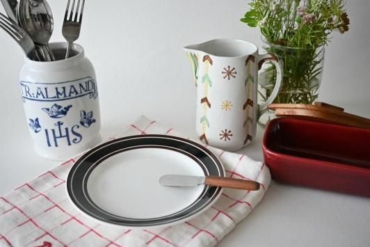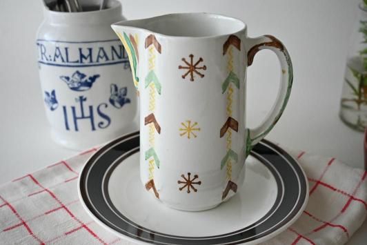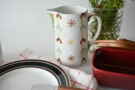 H13.0cm×W12.5cm 真っ白な陶器に、グラスグリーン、レモンイエロー、マロンのようなブラウンの 絵の具でのびのびとした幾何学模様が描かれた、クリーマー / ジャグです。 おそらく市販のジャグに個人的に絵柄を入れたものと思われますが、 なんだかほのぼのとしていてとっても可愛らしいのです。 傷かけのない、ヴィンテージ品として大変良い状態です。