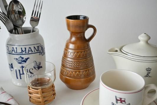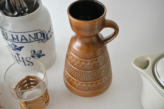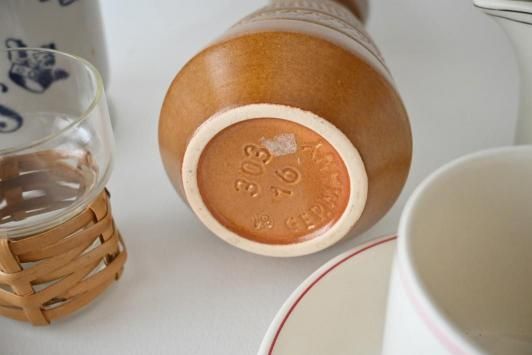 φ5.0cm×H16.3cm×W8.5cm ドイツ製の幾何学模様の陶器の一輪挿しです。 季節の花をテーブルに添えるのに、どんな器にも馴染む釉薬の色で、飾りやすい一品だと思います。 春先には水をたっぷりと入れて、球根の水栽培にもいいですね。 傷かけのない、ヴィンテージ品として大変良い状態です。 おそらく1960年代頃のものと思われます。