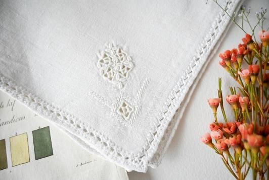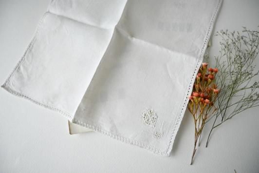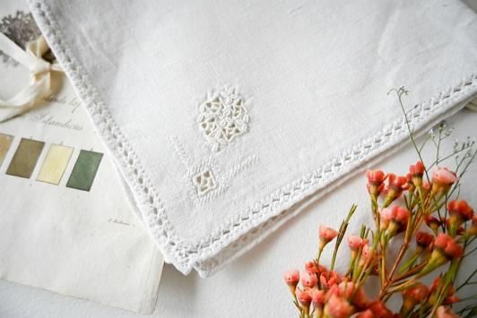 Size : W33.0cm×D32.0cm リネンのしっかりした生地の、美しいアンティークのハンカチです。 ハンカチとしてはもちろん、カゴにかけたり、机や棚に敷いてたり、 ディスプレイをお楽しみください。 3ヶ所ほんの小さなシミのようなものがありますが、 よく見ないと目立たない程度のものです。