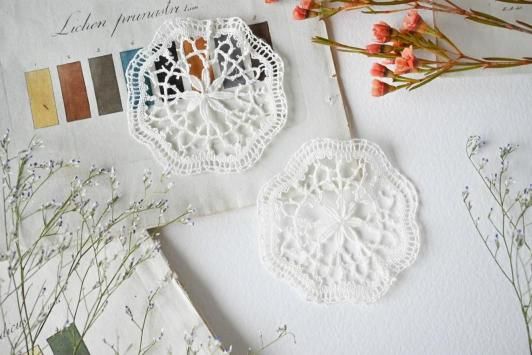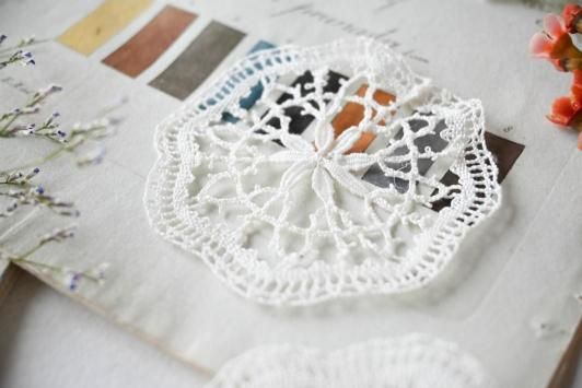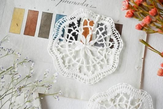Size : H6.2cm×W6.2cm 小さなかぎ編みのドイリー状のレースピースです。 細い糸でつなげてカーディガンのリメイクなどにしても素敵ですし、 何枚かを細いワイヤーとドライフラワーとでつなげて、窓辺に垂らしてもきっと素敵。 デットストック品の傷ほつれのない大変良い状態です。