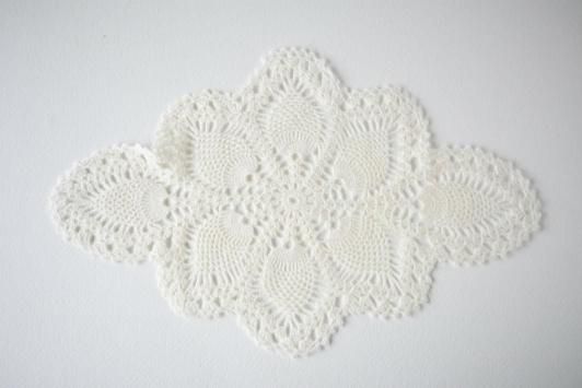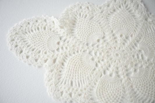 Size : H21.0cm×W32.5cm おそらくアクリルが混ざったるわふわの毛糸で編まれた、 オーバルの可愛らしいドイリーです。 小さなカゴやジャム瓶に生けたお花と一緒に、この甘い雰囲気を活かして飾っていただけたら。 ほつれやシミなどはなく、綺麗な状態です。