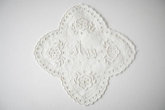 「Agg」、日本語で「たまご」と刺繍が施された小さなサイズののスクエアクロスです。