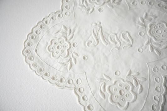 生地の縁をカットし、まとめながら模様を出していくホワイトワークで