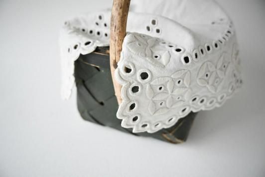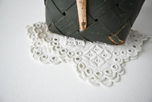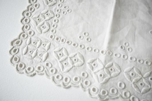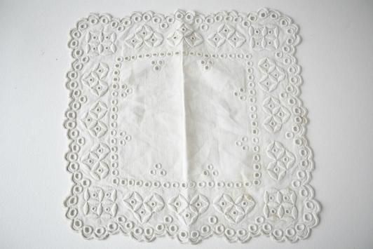 Size : H28.5cm×W30.0cm 生地から糸を抜き、まとめながら模様を出していくホワイトワークで お花の模様が施された小ぶりなサイズのスクエアクロスです。 よく洗い、使い込まれてくったりとした生地の手触りに惹かれて手にしました。 一角に薄いシミがみられますが、見た目が損なわれる程ではないですが、 気になる場合は物をのせて楽しんでいただけると思います。