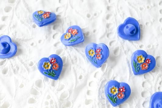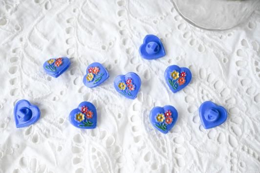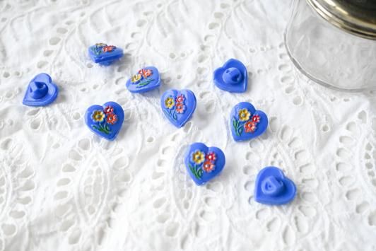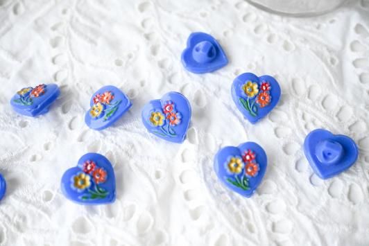 Size : H1.0cm×W1.2cm×L6.9cm ストックホルムで見つけましたが、チェコスロヴァキア製のハートの形のガラスボタンです。 ペイントが一部剥がれていますが、どれも美しく、お花がカラフルに彩色されています。 ボタン収集が趣味のお友達へのプレゼントに、あるいはご自身の収集箱への新たな宝物のひとつとして。 状態については画像にてご確認ください。