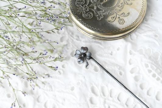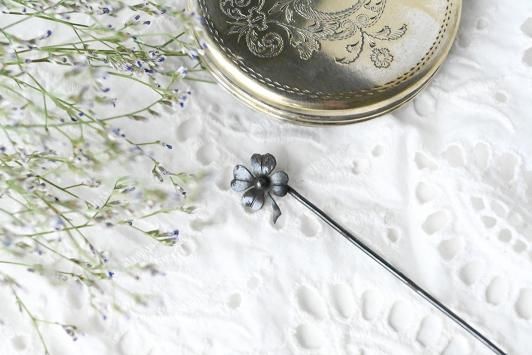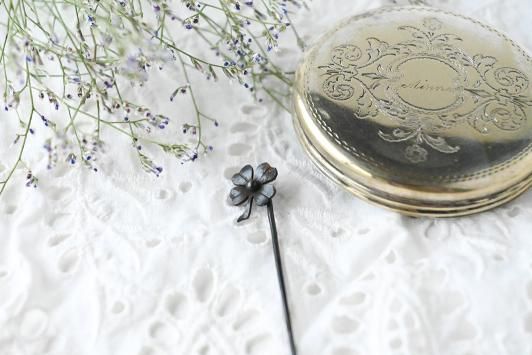 Size : H1.0cm×W1.2cm×L6.5cm フランスのアンティークのハット/タイピンです。 どちらもモチーフがとても可愛らしく、三つ葉のクローバーや鳩、宿木など、幸運のモチーフがデザインされた素敵な逸品です。 品の先に、コットンパールのピアスのキャッチなどをはめてあげると、 落とすことなく、また指先などを傷つけることなくお楽しみいただけます。 状態については画像にてご確認ください。