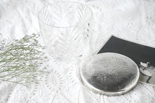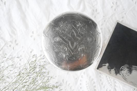 Size : φ8.3cm×H6.8cm Oden planにあるとても素敵なアンティーク店で見つけた、 美しい模様が入ったシルバー製の蓋がついたクリームジャーです。 しっかりと厚みがあるので、指輪などをしまうアクセサリーケースとしてもおすすめですし、キャンディポットとしても。 ガラス部分にまで装飾が施されているのは、珍しいタイプです。 経年による使用感が見られますが、歪みなどがなく、大変良い状態です。 ガラスのケース本体の縁のところに僅かにチップが見られます。
