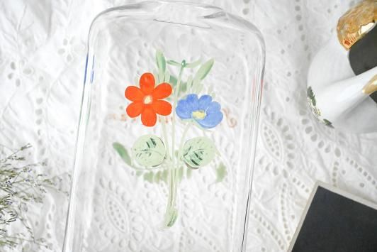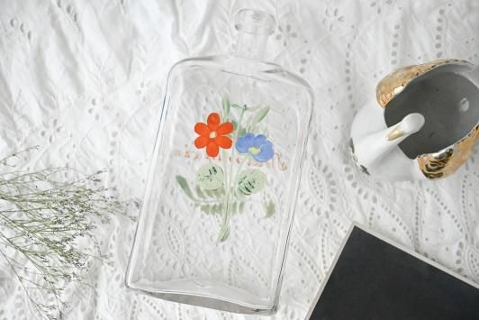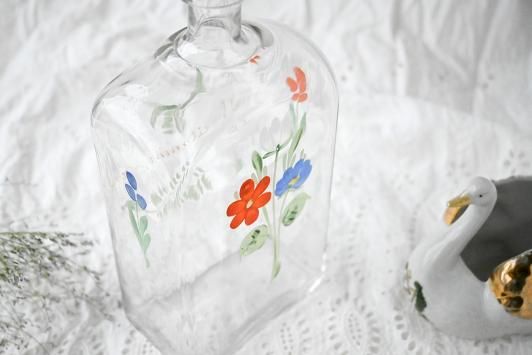 Size : φ19.4cm×H9.3cm×W5.5cm 2色のお花の絵がハンドペイントにて描かれたアンティークのリキュールボトルです。 ガラスの透明度や可憐なお花の姿が美しく、何も入れていなくても目がいく良さがあります。 梅シロップが出来上がる季節にはこんなボトルに入れて楽しんでも素敵ですね。 優しい色使いで、一輪挿しとしてもとってもおすすめです。 目立った傷かけのない、アンティーク品として大変良い状態です。
