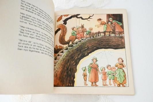 Size : H22.0cm×W21.2cm スウェーデンの国民的絵本作家エルサ・ベスコフによる代表作のひとつ。 リスの背に乗った子どもたちの冒険が描かれた温かな物語です。 背表紙に経年による裂けがあり、中のページが抜けていますが、表紙の色合いは柔らかく残り、装丁としての美しさも十分に感じられます。