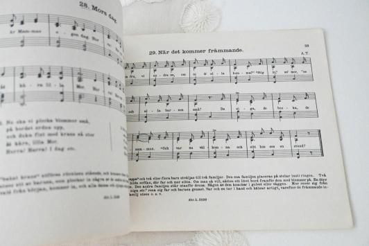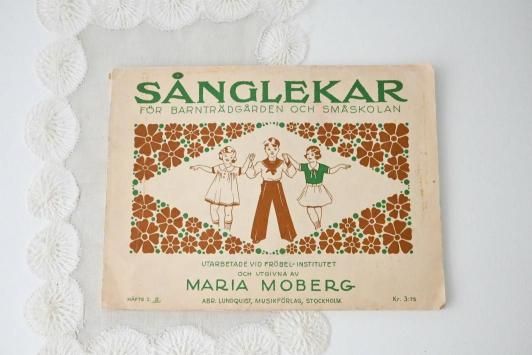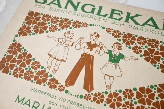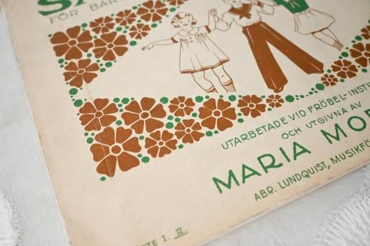 Size : H21.7cm×W28.0cm スウェーデンの教育者マリア・モーベリによる「歌遊び」の楽譜集。 花模様のフレームと、仲良く手をつなぐ子どもたちが描かれた表紙が印象的です。 経年のしみや折れが一部にありますが、全体的に状態は安定。 北欧の保育文化を伝える貴重なアーカイブとしておすすめです。