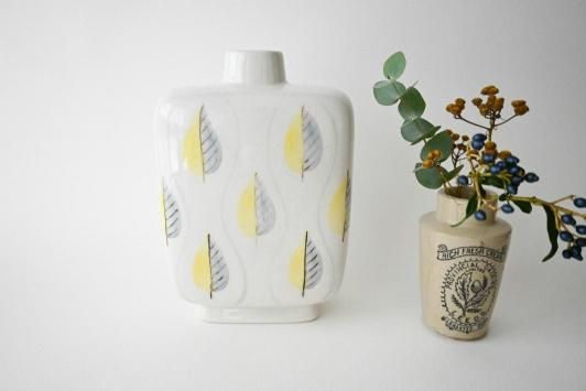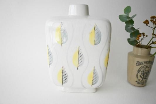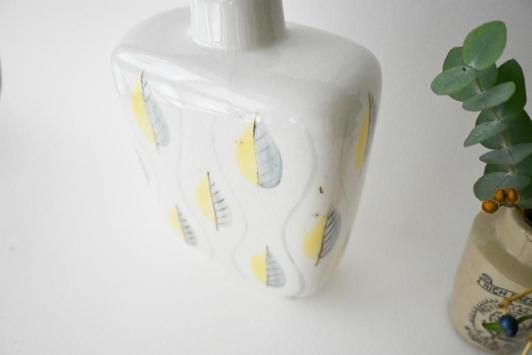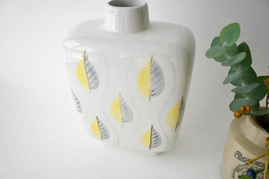 Size : H20.5cm×W14.0cm×D8.0cm レモンイエローとブルーグレイの絵の具で葉っぱが描かれた一輪挿し。 丸みを帯びたスクエア型で、葉の模様がやさしく流れるように配置されています。 表面に貫入とわずかな茶色のシミが見られますが、割れや欠けはなく全体は良好です。 シンプルな枝やドライフラワーを合わせると北欧らしい静かな空気感に。