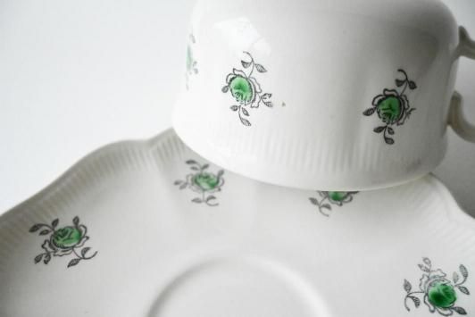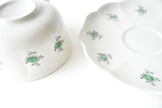 Size : カップ : φ11.2cm×H6.3cm×W13.5cm ソーサー : φ17.0cm Gefle(ゲフレ)の「Rosenhill(ローゼンヒル)」シリーズのカップ&ソーサー。 白地に爽やかなグリーンのローズが可憐に描かれた、北欧らしい上品で軽やかなデザインです。 縁には繊細なレリーフが施され、やわらかな光を受けて控えめに輝きます。 紅茶にもコーヒーにも合わせやすい程よいサイズ感で、日常使いにもおすすめ。 経年によるごくわずかな貫入や微細な擦れが見られますが、全体的にとても良いコンディションを保っています。 静かな時間に寄り添う、スウェーデンの優しいヴィンテージです。 ※こちらの商品は、製造より50年前後経つヴィンテージ品・アンティーク品です。 経年劣化や使用に伴う小さな傷、汚れなどがある場合がございます。 目立つ箇所はできる限り商品説明欄にてご案内いたしますが、あらかじめご了承ください。 また、気になる点がございましたらお気軽にご質問フォームよりお問い合わせくださいませ。