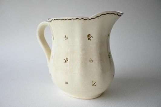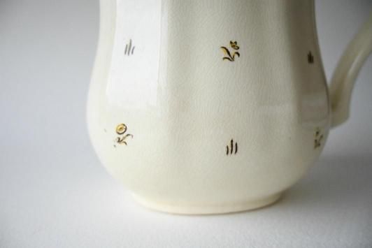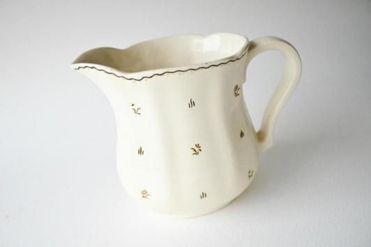 Size : H14.5cm×W17.5cm×D11.0cm Gustavsberg(グスタフスベリ)社の「KENNIA(ケニア)」シリーズのジャグ。 淡いアイボリーに手描き風の小花模様が愛らしく散りばめられ、縁の波型のラインがやさしい印象を添えています。 ふっくらとした曲線のフォルムは存在感がありながらも柔らかく、どこか素朴な温もりを感じさせます。 ジャグの中央部分に水しみによる使用感が見られますが、全体的に落ち着いた美しさを保っています。 ミルクやジュースを注ぐ用途のほか、花を活けてインテリアとして楽しむのもおすすめです。 KENNIAシリーズの中でもジャグは特に珍しく、見つけることが難しい一点です。 ※こちらの商品は、製造より50年前後経つヴィンテージ品・アンティーク品です。 経年劣化や使用に伴う小さな傷、汚れなどがある場合がございます。 目立つ箇所はできる限り商品説明欄にてご案内いたしますが、あらかじめご了承ください。 また、気になる点がございましたらお気軽にご質問フォームよりお問い合わせくださいませ。