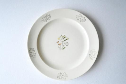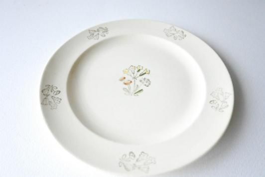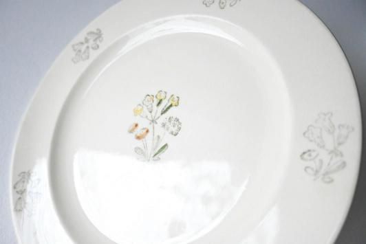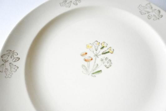 Size : φ21.3cm Rörstrand(ロールストランド)社のシリーズ名不明のプレート。 中央に描かれた三輪の小花が可憐で、北欧らしい素朴なあたたかみを感じるデザインです。 優しいタッチのイエローやオレンジ、グリーンの配色がやわらかなアイボリーの地に映え、 控えめながらも品のある佇まいを見せています。 縁には墨色のインク花模様がさりげなく配置され、全体にやわらかな統一感があります。 表面にはわずかな擦れや経年の兆しが見られますが、ヒビや欠けはなく良好な状態です。 シンプルな中にクラシカルな魅力を備えた、美しいヴィンテージプレートです。 ※こちらの商品は、製造より50年前後経つヴィンテージ品・アンティーク品です。 経年劣化や使用に伴う小さな傷、汚れなどがある場合がございます。 目立つ箇所はできる限り商品説明欄にてご案内いたしますが、あらかじめご了承ください。 また、気になる点がございましたらお気軽にご質問フォームよりお問い合わせくださいませ。