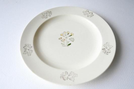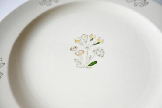 Size : φ21.3cm Size : φ21.3cm Rörstrand(ロールストランド)社のシリーズ名不明のプレート。 中央に描かれた三輪の小花が可憐で、北欧らしい素朴なあたたかみを感じるデザインです。 優しいタッチのイエローやオレンジ、グリーンの配色がやわらかなアイボリーの地に映え、 控えめながらも品のある佇まいを見せています。 縁には墨色のインク花模様がさりげなく配置され、全体にやわらかな統一感があります。 表面にはわずかな擦れや経年の兆しが見られますが、ヒビや欠けはなく良好な状態です。 シンプルな中にクラシカルな魅力を備えた、美しいヴィンテージプレートです。 ※こちらの商品は、製造より50年前後経つヴィンテージ品・アンティーク品です。 経年劣化や使用に伴う小さな傷、汚れなどがある場合がございます。 目立つ箇所はできる限り商品説明欄にてご案内いたしますが、あらかじめご了承ください。 また、気になる点がございましたらお気軽にご質問フォームよりお問い合わせくださいませ。