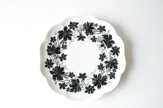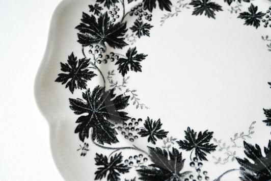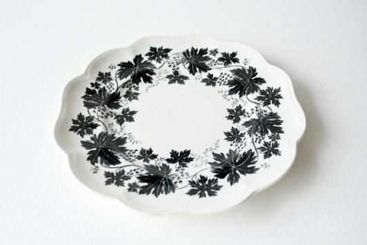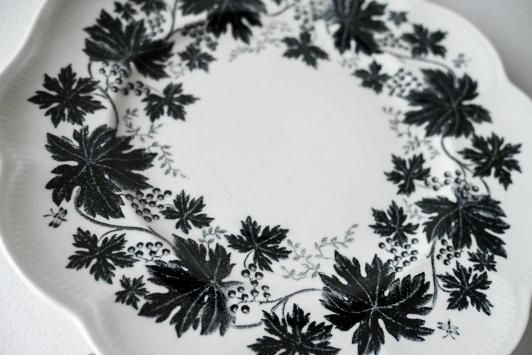 黒一色のぶどうの葉と蔓のモチーフがぐるりと縁を彩る、クラシカルでありながらモダンな印象のデザインです。